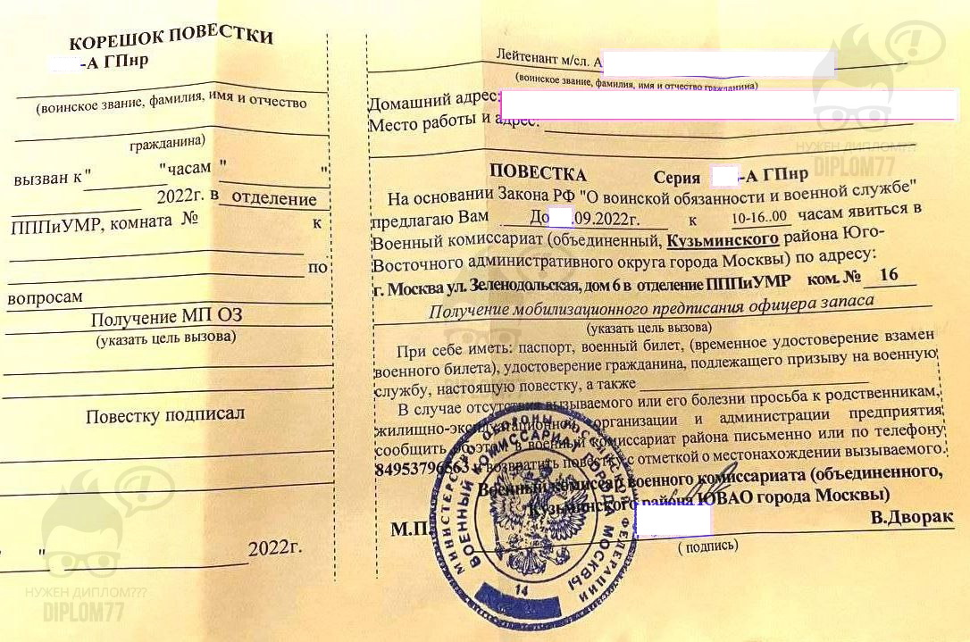 Ответ: Здравствуйте. Высылайте образец на WhatsApp +79052590480 или е-мейл zakaz@diplom77.com . Сделаем такую же повестку только на ваши данные. Стоить будет 10 000 рублей. Делается за 2-3 рабочих дня и плюс время доставки. Подробнее о вариантах оплаты и доставки здесь: https://d77wz.cfd/dostavka